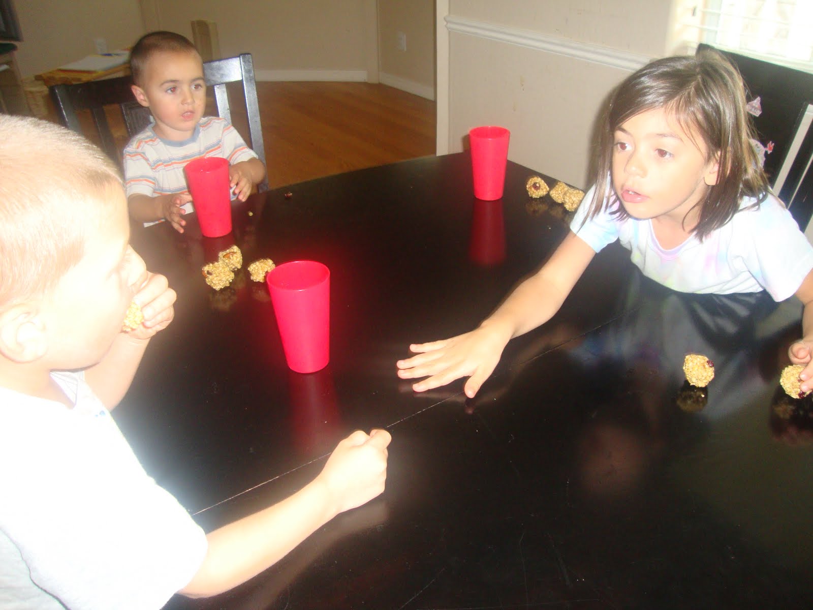 Here, she is teaching James about addition and subtraction, using what appear to be granola balls.